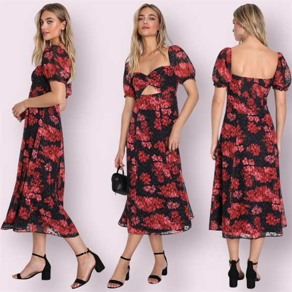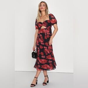 Your outgoing energy is a perfect match for the Lulus Truly Charming Black & Red Floral Puff Sleeve Cutout Midi Dress!