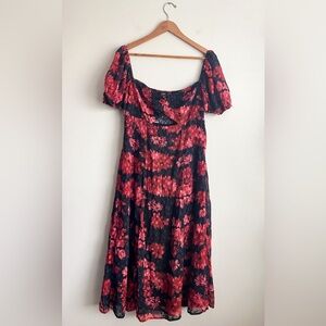Lulus Red Black Floral Midi Puff Sleeve Dress Dark Romantic Cocktail Sheer L