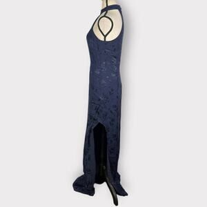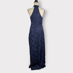 This stunning gown has a woven satin jacquard fabrication (with a floral design embossed throughout) that shapes a modified halter neckline, a darted sleeveless bodice, and a high fitted waist. The asymmetrically cut maxi skirt creates a sultry slit look. Hidden back zipper and covered button closures.
