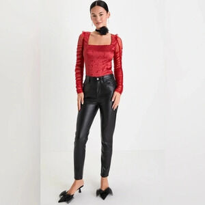 Lulus Red Floral Jacquard Satin Mesh Ruched Bodysuit