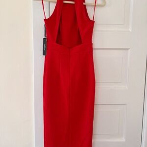 Never worn Lulus Red Halter Dress Front Slit Open Back, XS. Still has extra button included for buttons around neck! Brand new condition with tag still on it. Soft, small waffle texture and supportive around bust. Minimal stretch through waist and hip area.