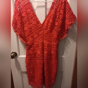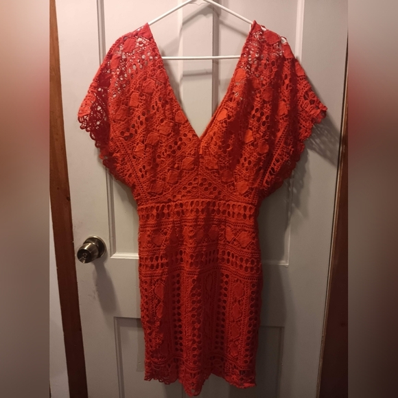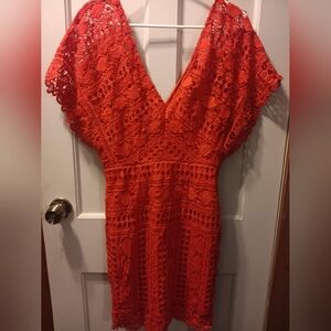 Little red dress. Lined with a lace Overlay. V neck. Zips up the back. Scalloped edges along sleeves and hem. In like new condition. Size medium from Lulus.