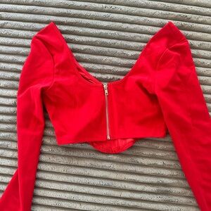 Bold red bodysuit with long sleeves. Features a flattering neckline. Perfect for a chic look. Has a zipper up the back. Then almost like a corset like pattern in the front.