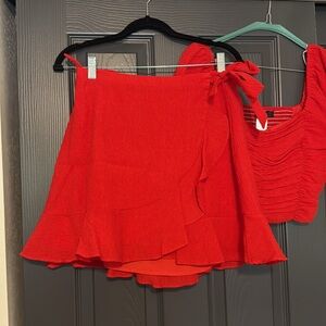 Chic red dress with ruched bodice. Puff sleeves and wrap skirt. Perfect for any occasion.