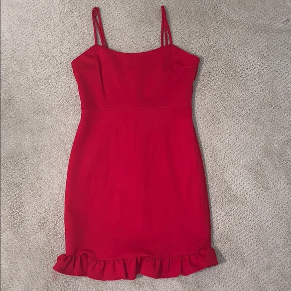 *Worn Once* Lulus red ruffle hem dress. Flattering and perfect for formals or fancy occasions. Adjustable straps and comfortable material.