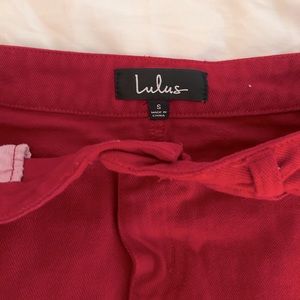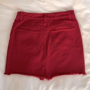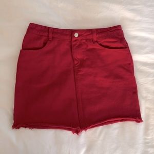 The Lulus Reed Red Denim Mini Skirt adds a little something extra to any look! A high waist with belt loops, top button, and zip fly sits above a mini silhouette with diagonal front pockets and frayed hem made from sturdy denim.