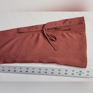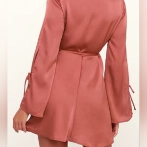Lulu's Finesse Rusty Rose Long Sleeve Wrap Dress Size XS. Satiny woven fabric shapes a classic flattering wrap dress with a surplice bodice, self tying waist, and a mini skirt. Long wide sleeves with trendy slits with ties. Loosely fits, lined dress, unlined sleeves.