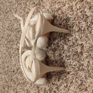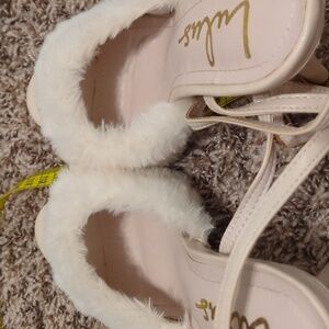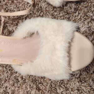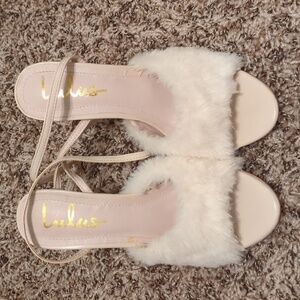 Lulu's Reluca ivory faux fur ankle strap high heel sandals