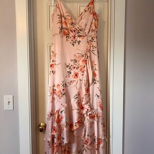 Lulus Remarkable Beauty Blush Pink Floral Satin Ruffled Midi Dress