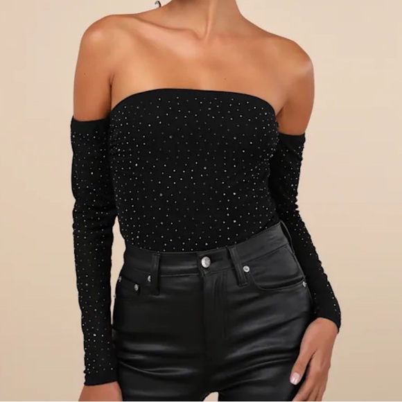 Lulus Shimmering Scene Black Rhinestone Mesh Off-the-Shoulder Bodysuit
