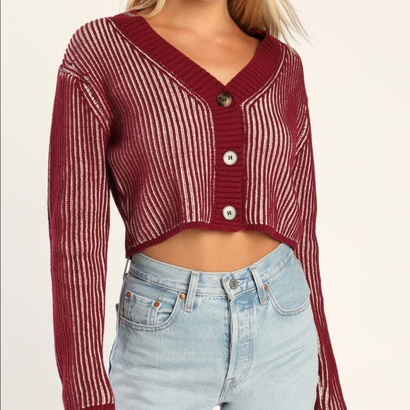 NWT Lulus Get The Stripe Wine Red Ribbed Cropped Cardigan