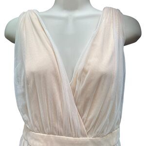 Step into elegance with this Lulus “Romantic Moment” maxi dress in nude cream. Featuring a sheer mesh overlay over a matching knit liner, this size Small gown highlights a plunging surplice bodice, fitted banded waist, and wide shoulder straps for support. The floor-length skirt flows beautifully with a hidden back zipper and clasp closure.