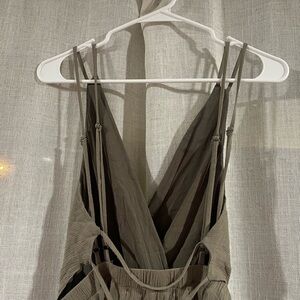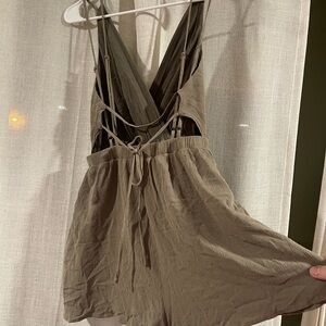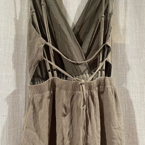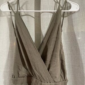 Soft olive green Lulu’s romper with adjustable straps. Elastic waist with flowy shorts and side pockets. Super cute! Wrinkled from sitting in a dresser over the fall seasons, but in excellent condition!