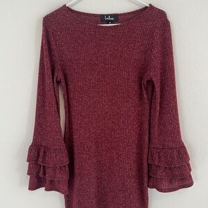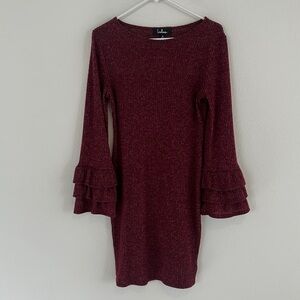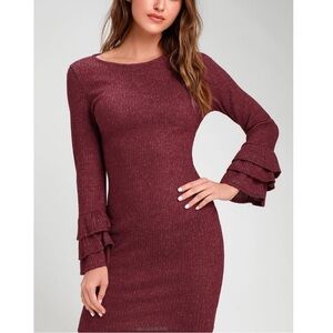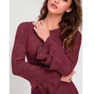 Lulus Rooney Heather Burgundy Flounce Sleeve Bodycon Sweater Dress ~ soft and slightly fuzzy ribbed knit that sweeps from a rounded neckline into a fitted bodice and a flirty bodycon dress. Long fitted sleeves end in ruffled tiered flounce cuffs.