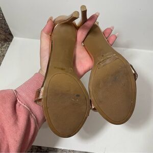 Gently worn women’s size 9 Lulu’s rose gold metallic simple strap heels. Please review all photos for any signs of wear-pictured as is. Disclaimer: Any items with any wear/staining has not been treated, and unsure of ability to remove/treat condition. Comes from a smoke free home, bundle with other items to save & minimize shipping cost.