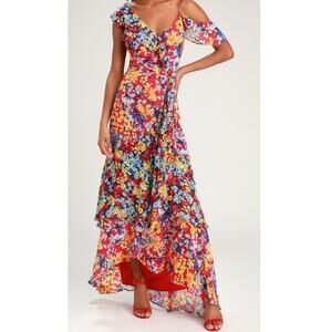 Lulus Ruby Red Floral Print Chiffon Maxi Dress XS Wedding Feminine Date Night