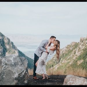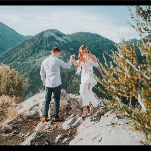 This dress has the most beautiful movement! Has some ruffles, off-the-shoulder sleeves, low v-back, and a high leg slit! It’s a beautiful dress. It’s in like-new condition! I’m 5’3 for reference.