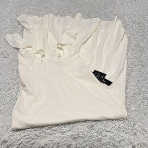 Elegant off white dress by Lulu's featuring stylish ruffle strap and deep V front. Zipper back, fully lined, floor length. Perfect for any occasion.
