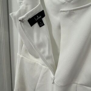 Lulus Miriam white ruffled bodycon mini dress. It’s very comfortable, simple and so cute! Only worn once for a night out during my bachelorette party!