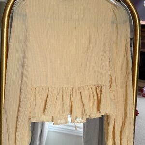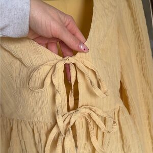 Chic yellow blouse with ruffle details. Features a stylish tie-front design. Perfect for casual outings.
