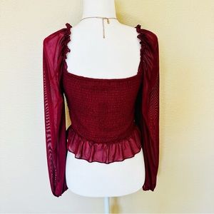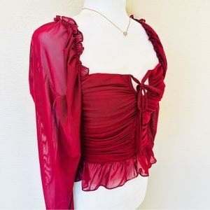 Perfectly Delightful Burgundy Mesh Ruched Ruffled Peplum Top by Lulu’s in size Medium.