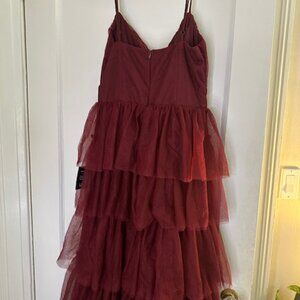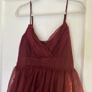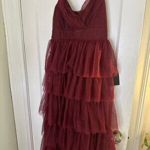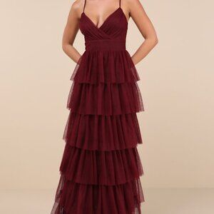 Lulus Rule The Runway Burgundy Tulle Surplice Tiered Maxi Dress - Size M