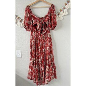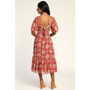 Lulus Rust Red Floral Back Bow Tie Puff Sleeve Midi Dress Party Fairy Wedding S