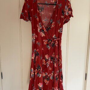 Lulus Rust Red Tropical Print Wrap Midi Dress