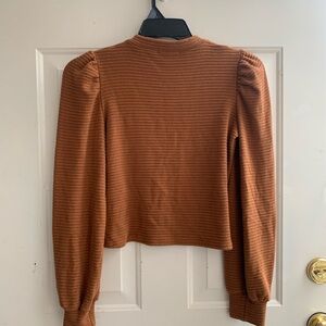 Stylish rust ribbed blouse with puff sleeves. Ideal for versatile wear.