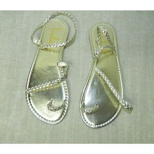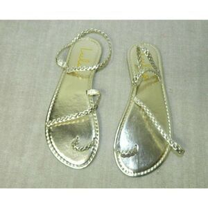 New w/out Box Lulus Mirela Gold Flat Sandals Metallic braided vegan leather forms a toe loop, plus two more straps that cross the vamp and wrap around the ankle.