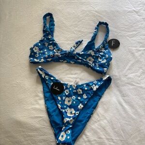 Never worn, tags still on. Just needed a different size. Lulus description: You'll rule as queen of the sandcastles and the starfish with the Lulus Sandy Dandy Blue Floral Print Tie-Front Bikini Top! Sleek tricot knit, with a fun floral print throughout (in hues of blue and white), shapes this cute bikini top with triangle cups,