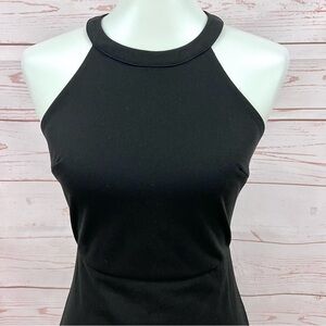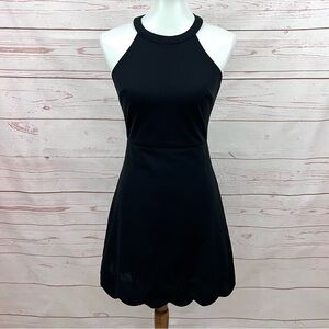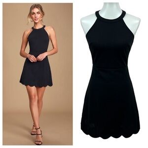 Lulu's Scallop Hem Little Black High Neck Halter Skater Mamacita Mini Dress. The perfect little black dress with a cute scalloped hemline. Stretch-woven poly, falls from a high halter neckline, into a sleeveless, darted bodice. Fitted waist and flirty skater skirt with a scalloped hem. Hidden back zipper/clasp. Fully lined. Size small in great condition!