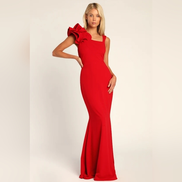 Lulu's Scarlet One-Shoulder Ruffle Mermaid Gown