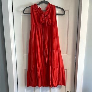 Chic scarlet dress with ruffled neckline. Ideal for stylish outings. Size medium. Worn only once, see last photo of it on!