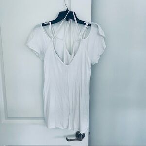 White scoop neck cap sleeve blouse. Lightweight rayon material. Straps cross across neckline and back. Very airy and flowy.