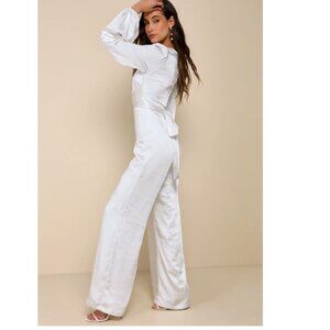 Lulus Sensational Evening White Satin Tie-Front Long Sleeve Jumpsuit Small NWOT