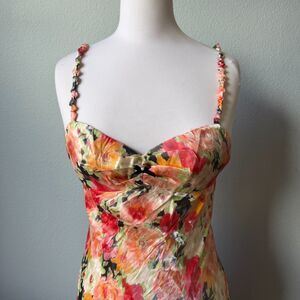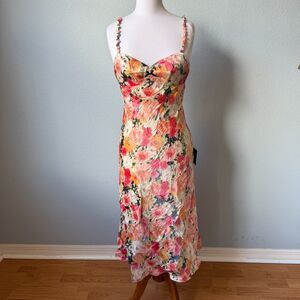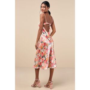 Lulus Sensational Spirit Peach Multi Floral Satin Tie-Back Midi Dress Size Small