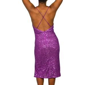 Lulus Shining Superstar dress FEATURES bright magenta sequin and thin spaghetti straps that criss cross in back. Rounded neckline. Fitted bodice. High thigh slits. Midi length. Back zipper closure. Lined.
