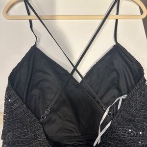 Stunning sleek black dress with sequin overlay, thin crossed straps, open back, and zip close!