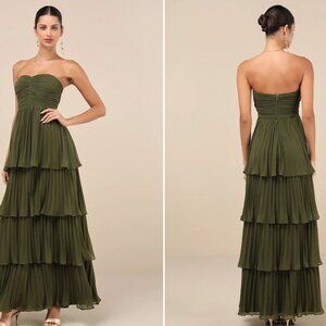 Brand new, never worn. Sweeping everyone off their feet is so easy when you have a romantic look like the Lulus Seriously Sensational Olive Green Strapless Tiered Maxi Dress! Lightweight pleated woven chiffon shapes this flirty dress that features a strapless bodice.
