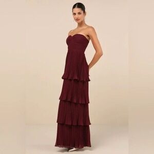 Keywords: Lulus, burgundy dress, strapless maxi dress, tiered dress, formal dress, cocktail dress, party dress, evening gown, wedding guest dress, special occasion dress, ruched bodice, sweetheart neckline, elegant dress, maxi dress