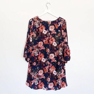 Long sleeve, open shoulder, flowers, floral, navy blue, boxy, shoulder cutouts, lined, all season, lunch, bridal shower, party, wedding, casual dress
