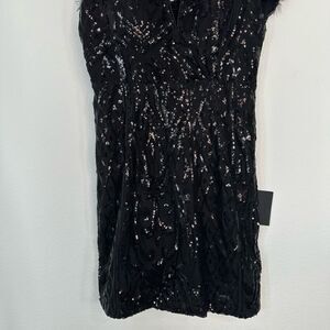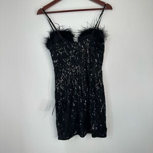 Lulus Shining Presence Black Sequin Embellished Mini Dress with Feathers NWT