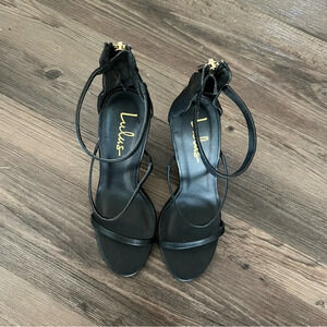 DETAILS: Lulus size 7. Isabella style in black with lucite heels, ankle strap, back heel zip closure, vegan leather.