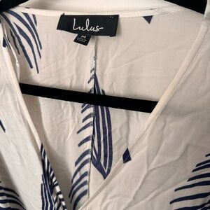 Lulus Exclusive! Be ahead of the trends in the Lulus Sign of the Times White and Navy Blue Leaf Print Maxi Dress! Lightweight woven rayon, with a navy blue leaf print, shapes short kimono sleeves and a surplice bodice with modesty snap. Elastic, and attached sash belt, cinch the waist above the slit maxi skirt.