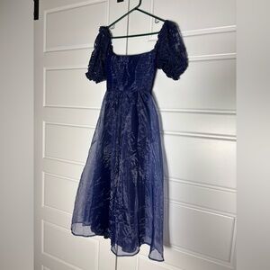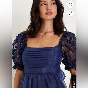 Keywords: Lulus dress, navy organza, puff sleeve dress, formal dress, wedding guest dress, bow back, size small, NWT, cocktail dress, party dress