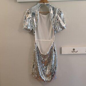 Shimmering silver mini dress. Features sequin detailing. Puff sleeves add elegance. Perfect for parties.