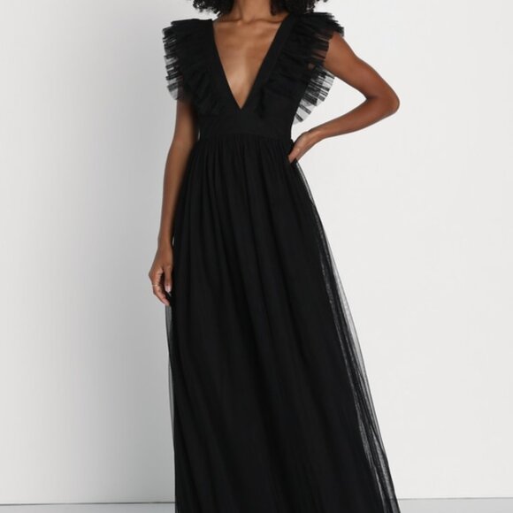 Lulus Simply Delighted Black Mesh Ruffled Backless Maxi Dress - Size M