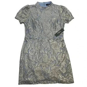 Lulus Size Medium Party of One Slate Blue Gold Metallic Backless Mini Lace Dress