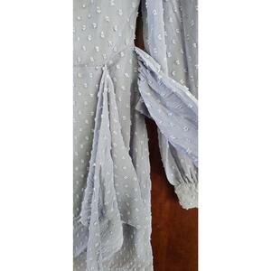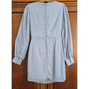 This is a Lulu's dress in size XS with a Swiss dot pattern in slate blue. It has long sleeves, a round neckline, and a faux wrap accent. The dress is short in length, lined, and features a zip closure. It is suitable for occasions like weddings, parties, work, or business events, and is ideal for the seasons of summer, fall, and spring.